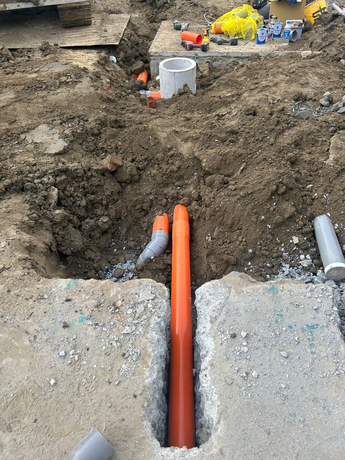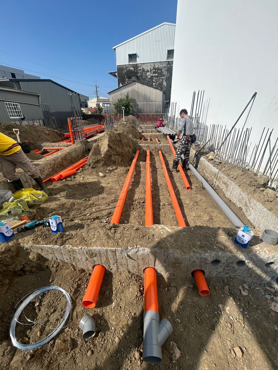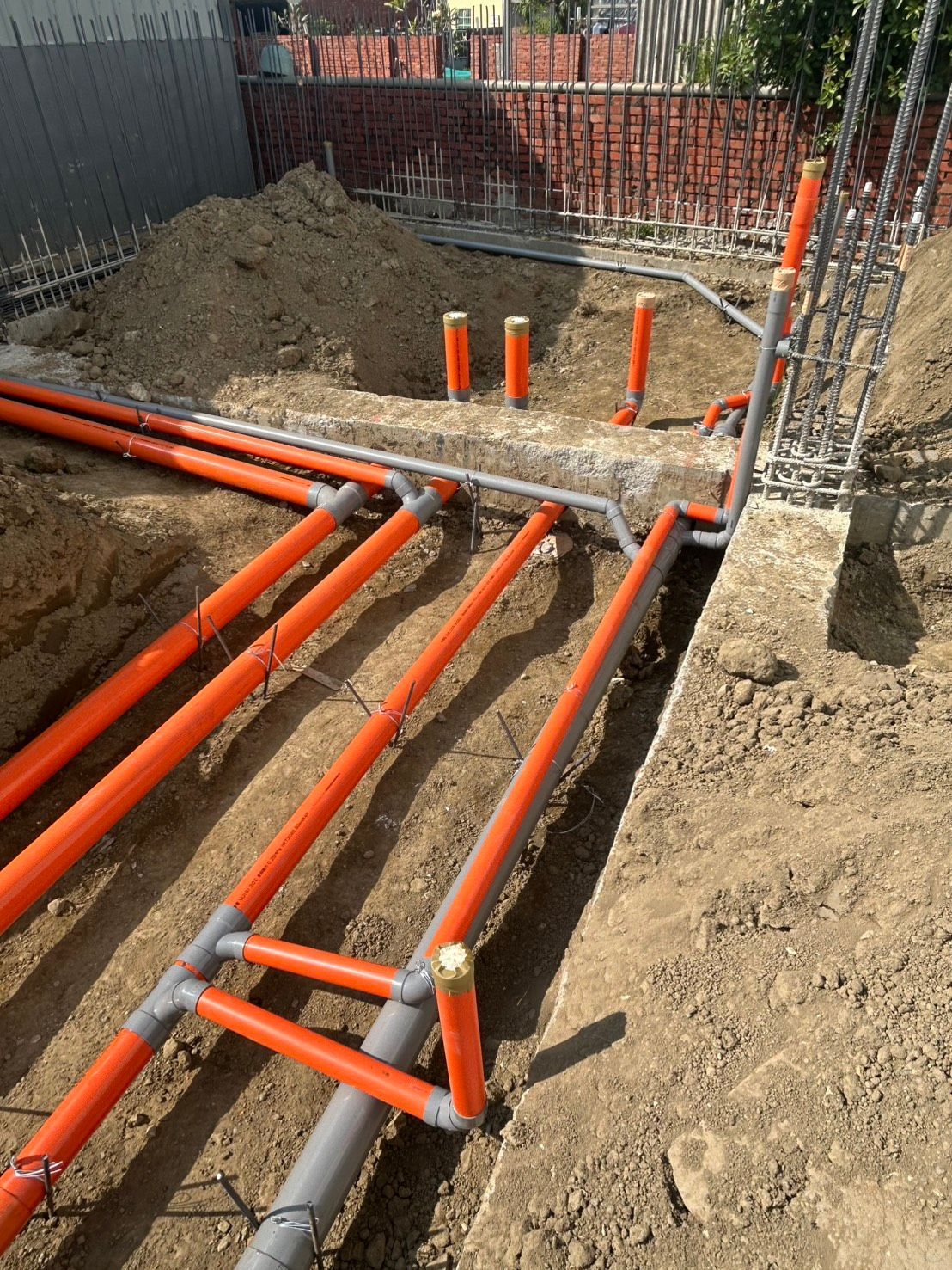 橘色的污水管、灰色的雨水管,在地面下交織成一個完整的排水系統。每一段管線的位置、每一個轉角的弧度、每一處接頭的密合度、每一段坡度的角度,都經過仔細計算與施工。